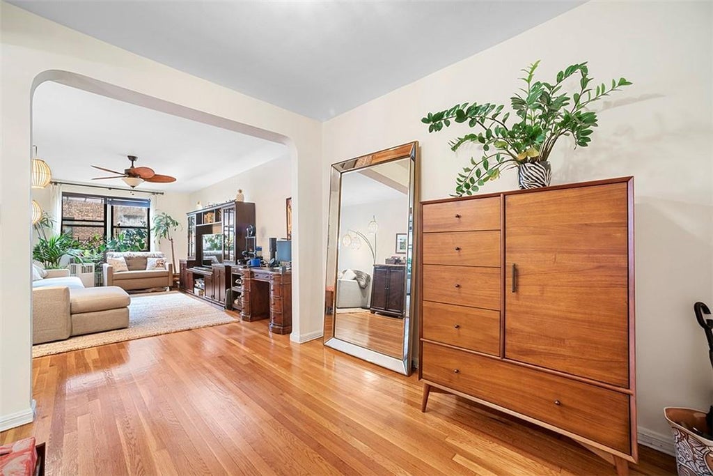 Live in the best elevator building in Forest Hills! When entering you are greeted by two spacious coat closets leading to the foyer which makes a great extra space for; home office, library, or bar area. This leads via a beautiful archway welcoming you to the living room which can easily accommodate any furniture set and entertainment system. The fully renovated kitchen with large window and lots of storage space in the cherry wood cabinets, stainless steel appliances including dishwasher. Beautiful dining space in the kitchen can accommodate a table for six. Perfect for entertaining family and guests. The bedroom can easily fit a king sized bed, dresser, and two good-sized closets of this unit. The Building is located on one of the loveliest blocks in all of Forest Hills with beautifully landscaped courtyards. If you have trouble seeing yourself in certain apartments and seeing how your things will fit make an appointment to see this designer style apartment! Commuter dream!