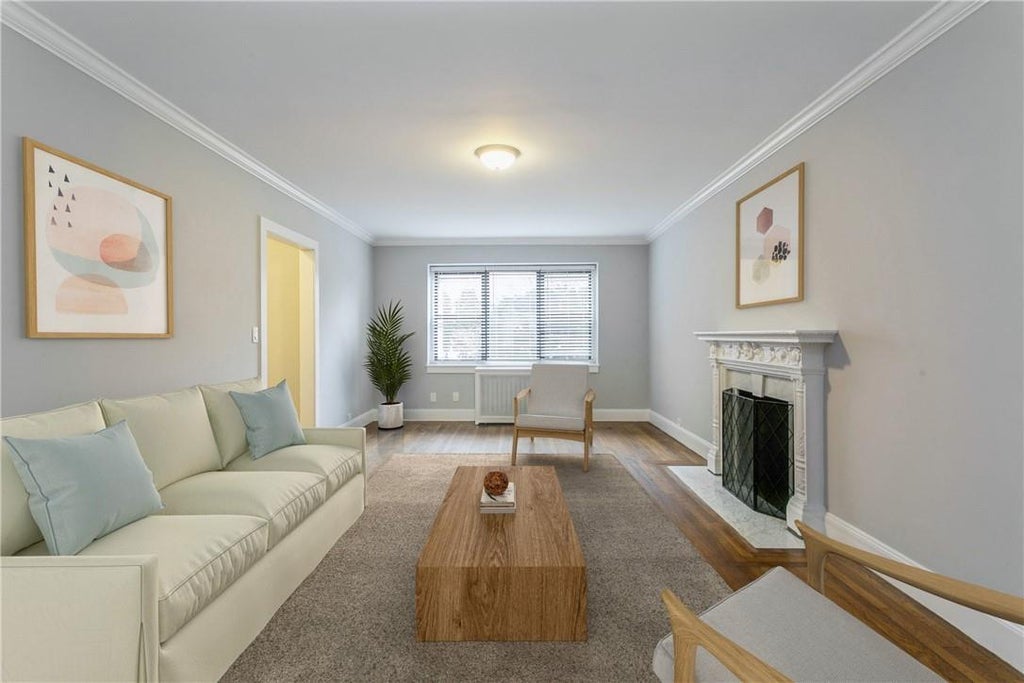 Location, location, location! Looking for a 5 minute walk to Larchmont Village and Train station, Look no further. This 2 bedroom, 1 bath coop has been completely renovated and includes an updated kitchen with custom cabinetry, new stainless steel appliances, Caesarstone Calacatta Nuvo counter tops and new backsplash. An entrance way w/spacious closet, a large living room with wood burning fireplace, spacious dining room, two generously sized bedrooms and updated bathroom complete this apartment. Unit has been freshly painted and features refinished hardwood floors throughout, custom blinds and over head lighting. Larchmont Woods has a live in super. Resident Street Parking is available with Town of Mamaroneck passes - $25 annually. Some photos have been virtually staged