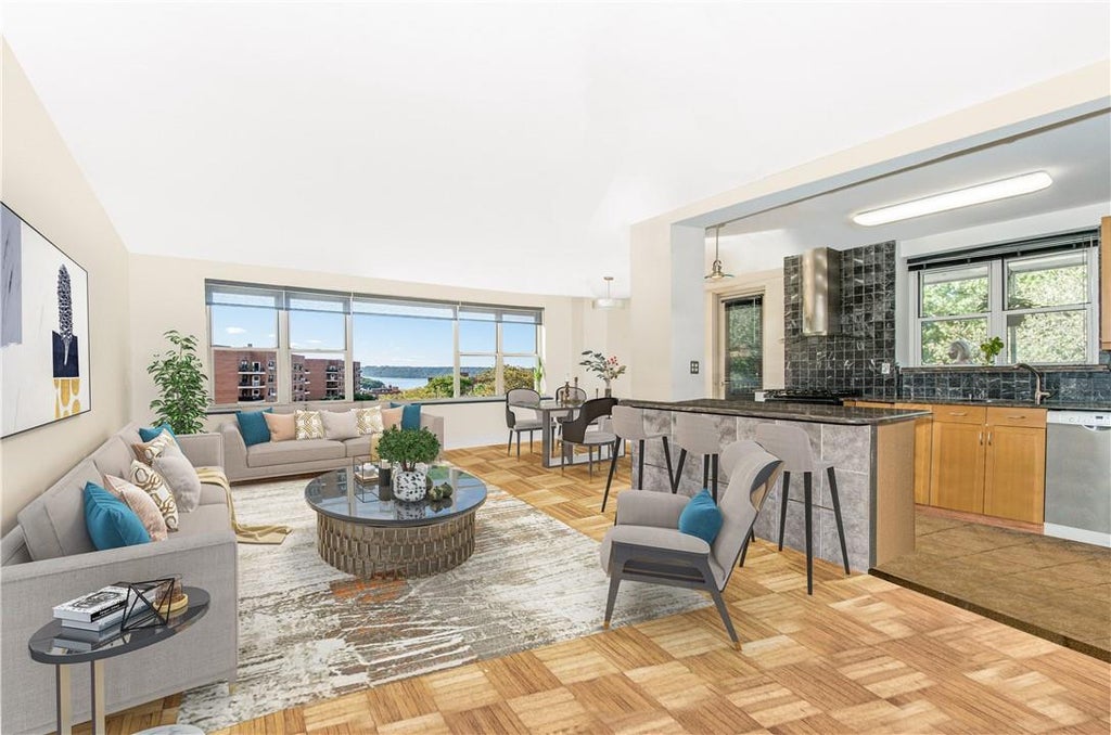 Spectacular, oversized 2 bedroom 2 bathroom corner apartment with direct south and west views of the Hudson River, The Palisades and overlooking Henry Hudson Park. This renovated apartment offers open plan living/dining/kitchen with granite counters, wood cabinets, tumbled marble backsplash, tile floor, Bosch dishwasher, Kitchen Aid stove. Renovated Master bath with porcelain walls and tile floors. Marble hallway bathroom with Jacuzzi tub. Screened, tiled large terrace facing Henry Hudson Park. 8 closets and beautiful parquet floors. Building amenities include part-time doorman, Live-in super, storage space, bike room, laundry and indoor and outdoor parking available, pet friendly. Walk to Spuyten Duyvil Train Station (25 min to Grand Central Station), local and express bus stops around the corner, close to shopping, restaurants and parks. MUST SEE.