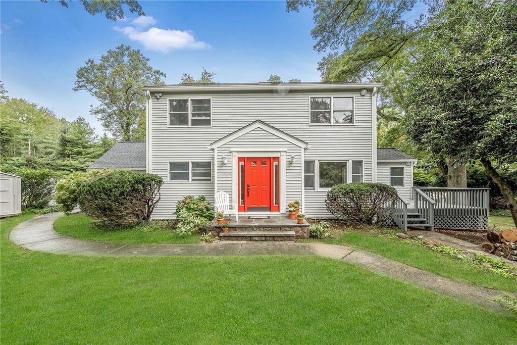 Spacious, bright, freshly painted colonial was completely rebuilt in 1984. Nestled back on a quite private street, this homes sits on 1/2 acre of beautiful property. Entrance way leads to a large Eik with stainless appliances and full dining area. Entering the formal living room, featuring fireplace and built-ins with brand new sliding glass doors leading to a freshly painted deck overlooking fabulous grounds. First level also features a family room/office /den, half bath with laundry and access to a two car garage. Master-bedroom suite has an updated bath with skylights and walk-in-closet. Two other nice size bedroom and hall bath. Utility basement. Upgrades are: new top of the line roof, gutters, soffit, front door, basement banister and skylights. This home has a great flow for entertaining. Star reduction is not included in taxes.
