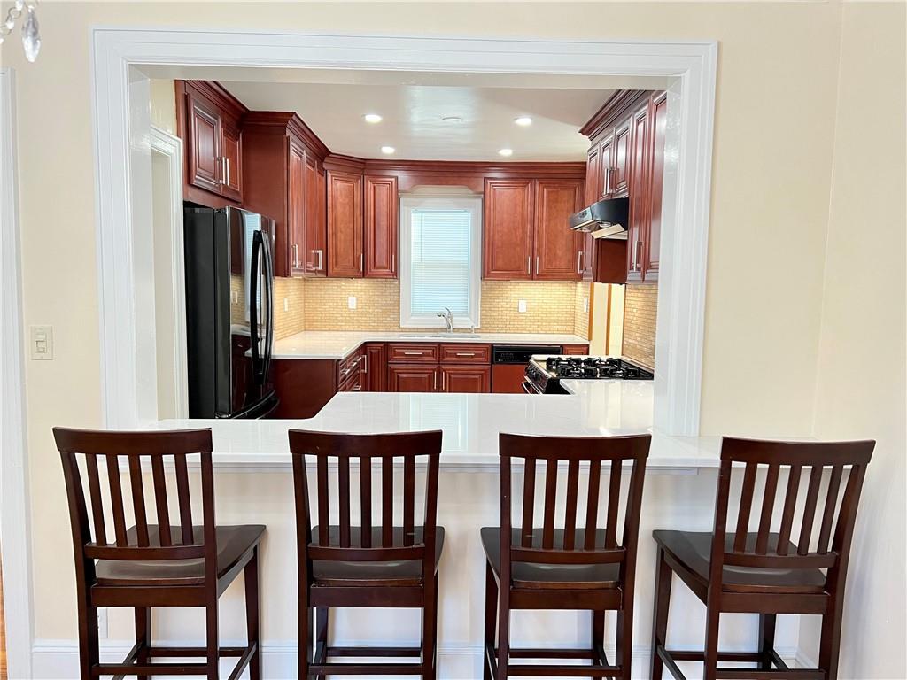 ALL utilities included. Fully renovated. 4 Bedrooms 2 full bathrooms. Home Office. Modern eat in kitchen, high end appliances, with breakfast bar & 2 pantry closets. Tasteful Separate Dining Area and Large Living Room. First floor master bedroom (king size bed possible) and Second floor private master suite (king size bed possible) with private bathroom and full of closets. Tons of storage 10+ closets. Plus huge storage room. Hardwood floors in all areas except kitchen and bathrooms. Gas steam heating and Built-in Air conditioning in Living room, Dining room & kitchen. Lower level laundry room. Large private elevated back terrace with railings & roof. Pre-programmed Smart thermostat with room sensors. Full access to lush front garden with built in bench. Two exclusive side by side, full size parking spaces in back parking pad. All exterior maintenance will be taken care of by owner so stress free living! 30 Min to Manhattan and near major shopping and highways. Coveted neighborhood.