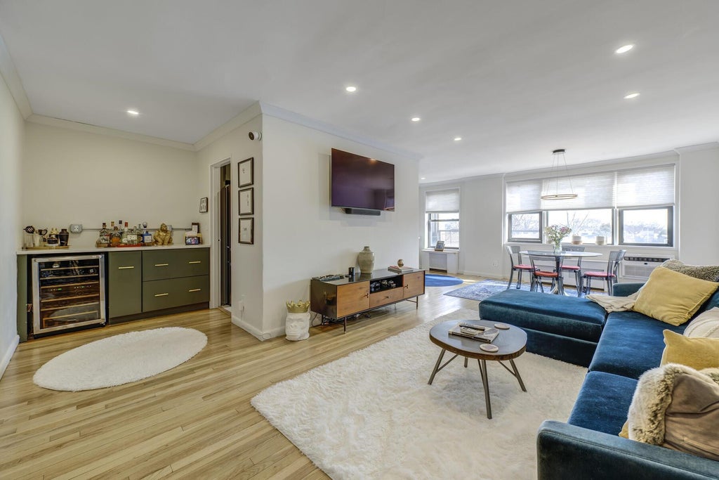 This beautifully updated Madison model apartment features a spacious open floor plan and a stunning new kitchen with high-end appliances, quartz countertops, brand-new cabinets, and Italian marble tile flooring. The built-in bar with a wine refrigerator and a separate coffee bar add both style and functionality, offering additional quartz countertops and extra storage. The primary bedroom provides ample closet space, and the fully updated hall bath and large hall closet enhance the overall look of the apartment. Elegant crown molding, upgraded lighting, and modernized electrical systems run throughout the apartment. Enjoy abundant natural sunlight, gleaming hardwood floors, and generous storage. 24-hour gated security, close to LIRR, shops, restaurants, schools. This move-in-ready apartment includes one assigned parking spot—a must-see!