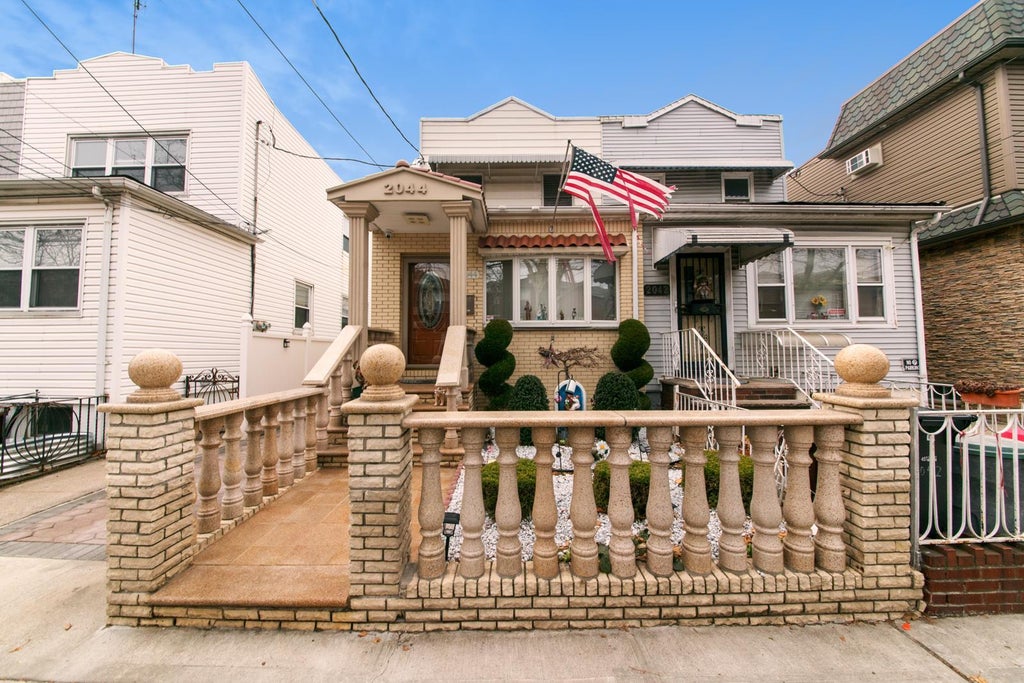 Enter into a bright, open living room featuring 9-foot ceilings, ceramic tile flooring, a coat closet, recessed lighting, and a striking tiled statement wall. The fully upgraded kitchen is a true centerpiece, offering a dramatic accent wall, a 9-foot island, brand-new cabinetry, stainless steel appliances, granite countertops, and recessed lighting. A convenient powder room sits just off the kitchen. The kitchen opens to a spacious family and dining area highlighted by a skylight and sliding glass doors that lead to a deck and a completely redone backyard—perfect for entertaining. Two north-facing windows and an additional closet enhance functionality on this level. An oak staircase with custom wall finishes leads upstairs to a small landing. The first bedroom features a window, wall air-conditioning unit, full closet, and engineered flooring. A full bathroom offers a stand-up shower and window. The hallway includes a linen closet. The primary bedroom boasts two south-facing windows, a large closet, and a split-unit air-conditioning system. The finished basement provides exceptional storage and flexibility, including a large linen and seasonal storage closet, an additional pantry/tool closet, and space that can double as a bedroom. A separate area conceals the laundry room and includes two more storage closets for daily essentials. The mechanical room houses a gas boiler and hot water heater and offers direct access to the backyard. The backyard has been completely redone with pavers, creating a private and polished outdoor retreat. Contact Listing Broker for Details